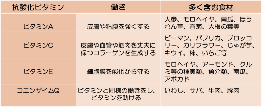 体内で余分に発生した活性酸素やフリーラジカル(酸化力の強い分子)などのダメージから細胞を守る働きのこと。特にビタミンA、ビタミンC、ビタミンEは抗酸化ビタミンと呼ばれ、強い活性酸素消去力を持っています。